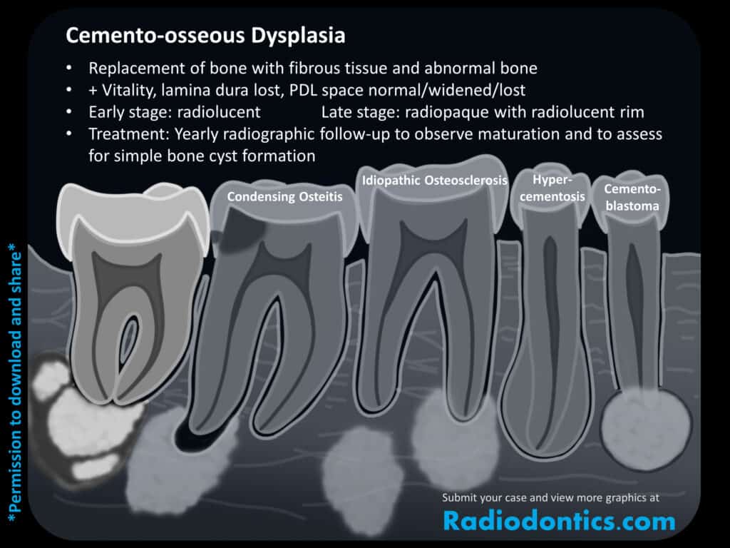 Cemento-osseous dysplasia is a replacement of the normal trabecular bone with fibrous tissue and cementum-like/abnormal bone. It begins as a well-defined radiolucency associated with the apices of teeth and as the lesion matures, radiopacities (often crescent-shaped) begin to appear around the tooth apex. Late stage lesions present as dense radiopacities with a radiolucent border surrounding it. There is often a periphery of sclerotic bone of varying width that may appear as a cortical outline. When cemento-osseous dysplasia directly involves the teeth, the lamina dura may be lost and the PDL space will either appear normal, widened or may be lost as well; however, the involved teeth remain vital, so please don't confuse an early lesion for periapical inflammation! If the lesion is large enough to involve the adjacent cortices, thinning and expansion of the cortices may occur.