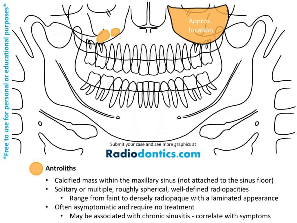 Antroliths appear as a calcified mass within the maxillary sinus separated from the adjacent sinus floor. Antroliths are often formed in the environment of chronic sinusitis and may originally calcify from a nidus of inflamed mucus, pus, clots or foreign bodies.